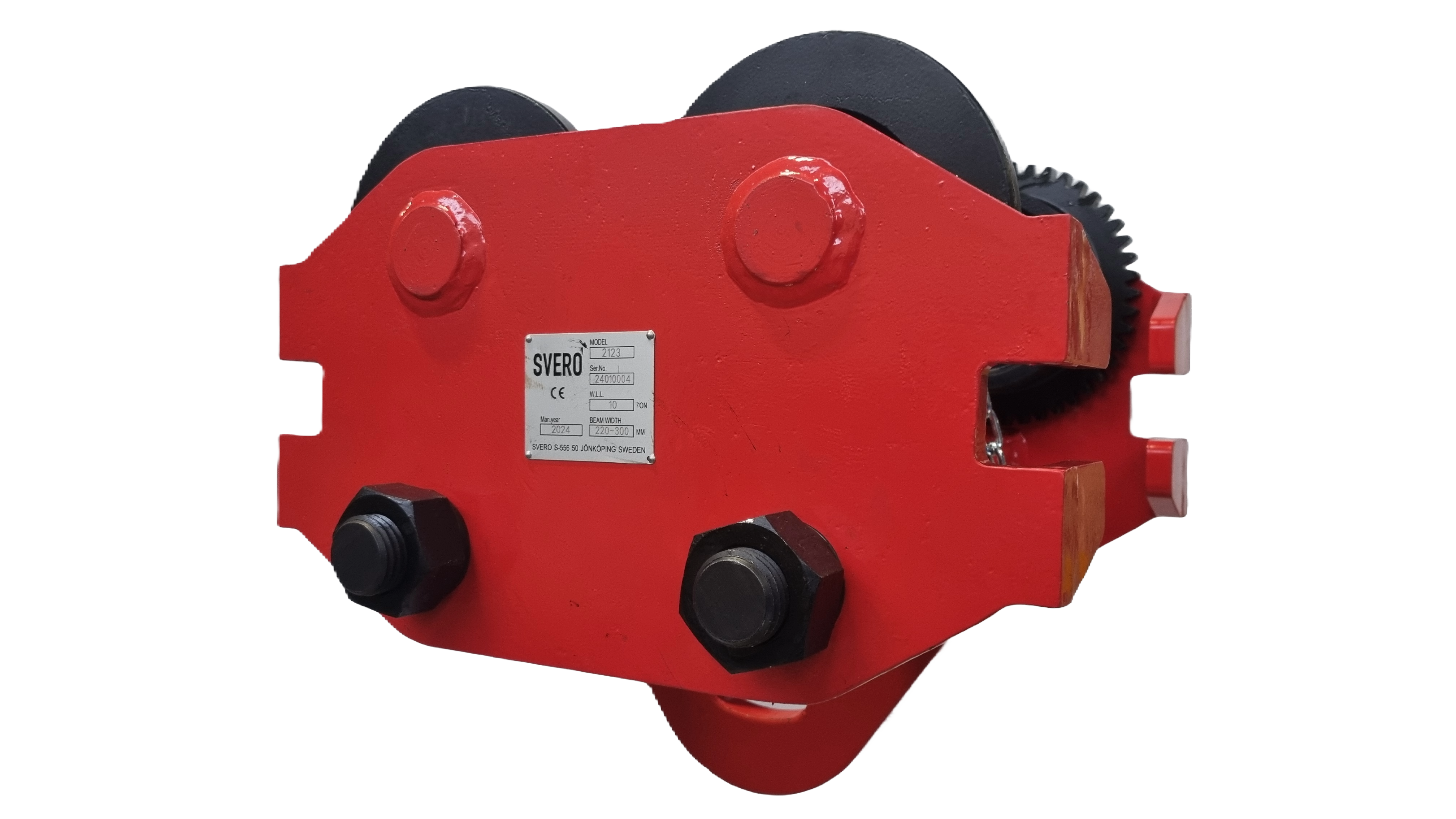 Senaste modellen av SVERO’s balkvagn/blockvagn 10.000 kg. För riktigt tunga behov inom industri och exempelvis underhåll och service av större maskiner. Finns även med kättingdrift.