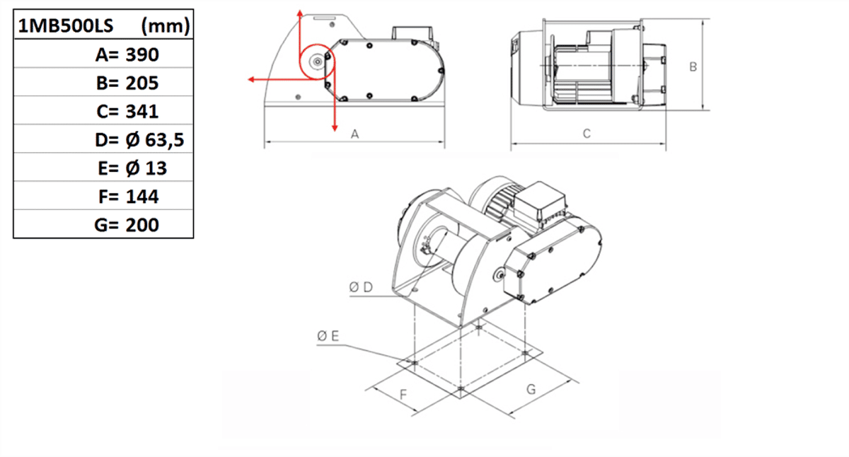 Anpassad för enkla lyft och drag, Kompakt och robust konstruktion. Manöverhandtag med nödstopp (3 m kabel). Levereras med gränslägesskydd
